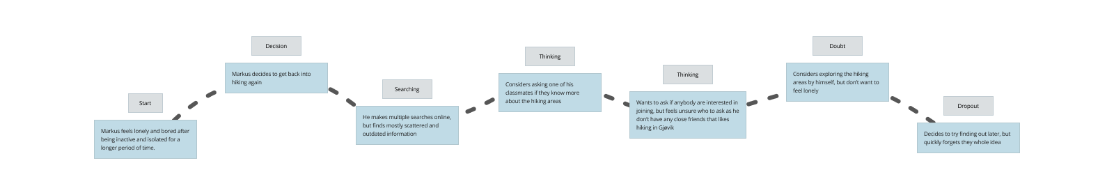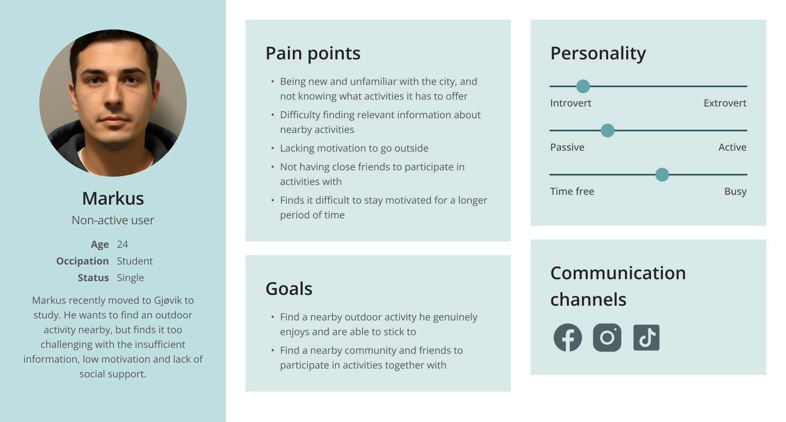 Markus (24) is a persona that represents non-active users. He recently moved to Gjøvik to study. Although he enjoys outdoor activities, he struggles with motivation and doesn’t know where to find reliable information or people to join him.